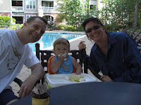 We decided the best way to celebrate her birthday in this stage of life was to get some cupcakes from the local store and invite some neighbors to help us celebrate. Charlie and MaryAnn, our immediate neighbors joined in the festivities by the complex pool. A great spot considering the mess made by a one year old and a cupcake with frosting! She even smeared it on her belly. Randy planned things right. We had just been swimming, so he had her in swimsuit bottoms but had taken of the top.